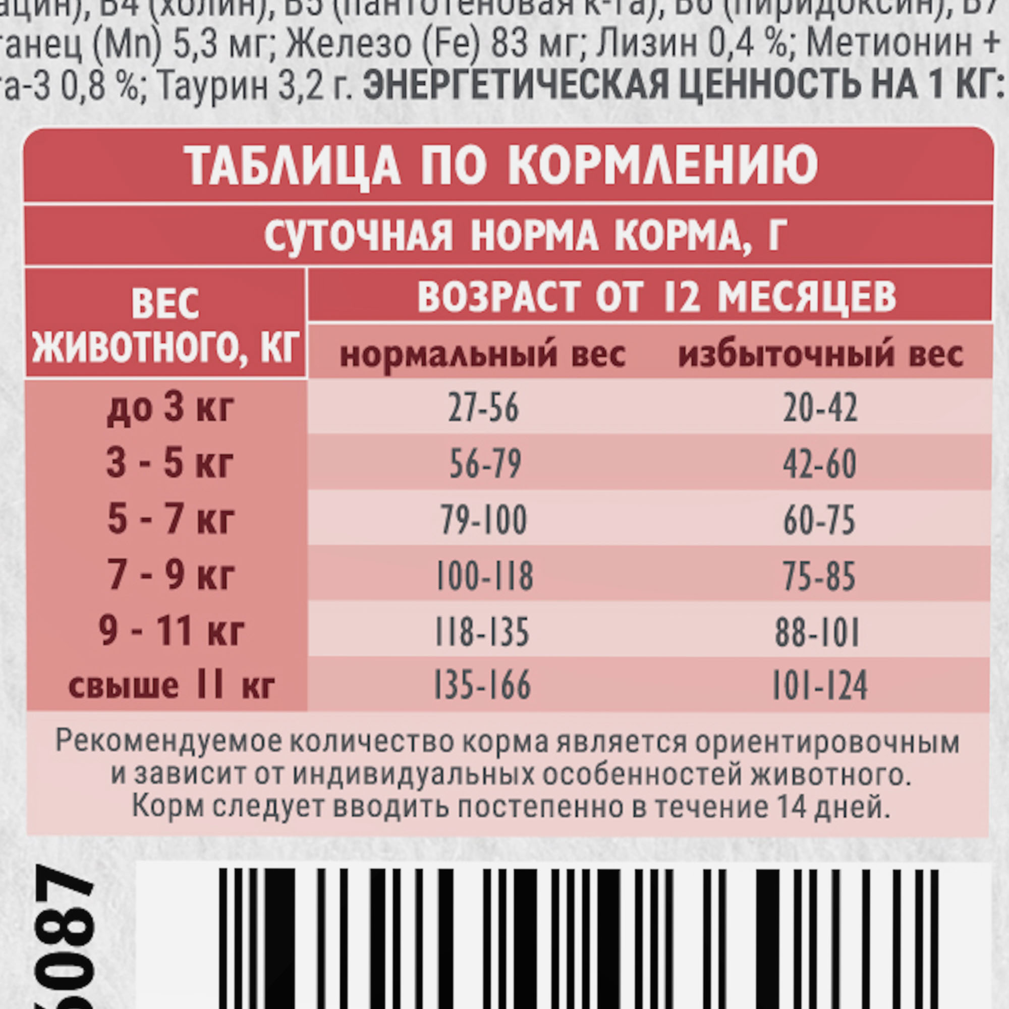 Питательные добавки на 1 кг: Витамин A 20635 МЕ; Витамин D3 3480 МЕ; Витамин E 88 МЕ; Витамины группы В 2555 мг: В1 (тиамин), В2 (рибофлавин), В3 (ниацин), В4 (холин), В5 (пантотеновая к-та), В6 (пиридоксин), В7 (биотин), В9 (фолиевая к-та); Калий (K) 0,9 %; Медь (Cu) 17,5 мг; Цинк (Zn) 219,5 мг; Селен (Se) 0,3 мг; Марганец (Mn) 5,3 мг; Железо (Fe) 83 мг; Лизин 0,4 %; Метионин + цистеин 0,4 %; Хлориды 1,3 г; Омега-6 0,8 %: Линолевая кислота 0,6 %, Арахидоновая кислота 0,2 %; Омега-3 0,8 %; Таурин 3,2 г.
