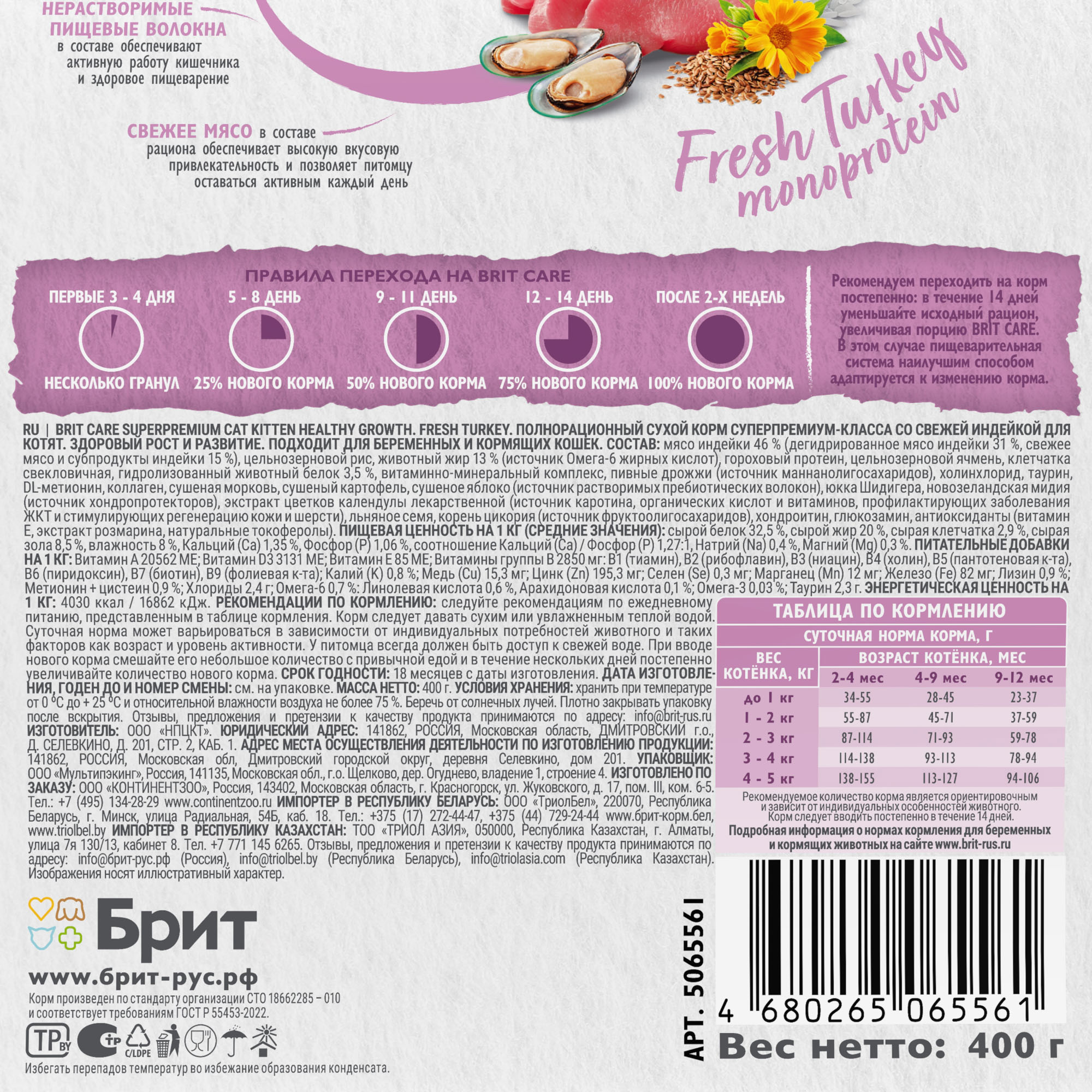 BRIT CARE, Сухой корм с индейкой д/котят, бер.и корм.кош "Cat Kitten Healthy Growth", 0.4кг, 5065561