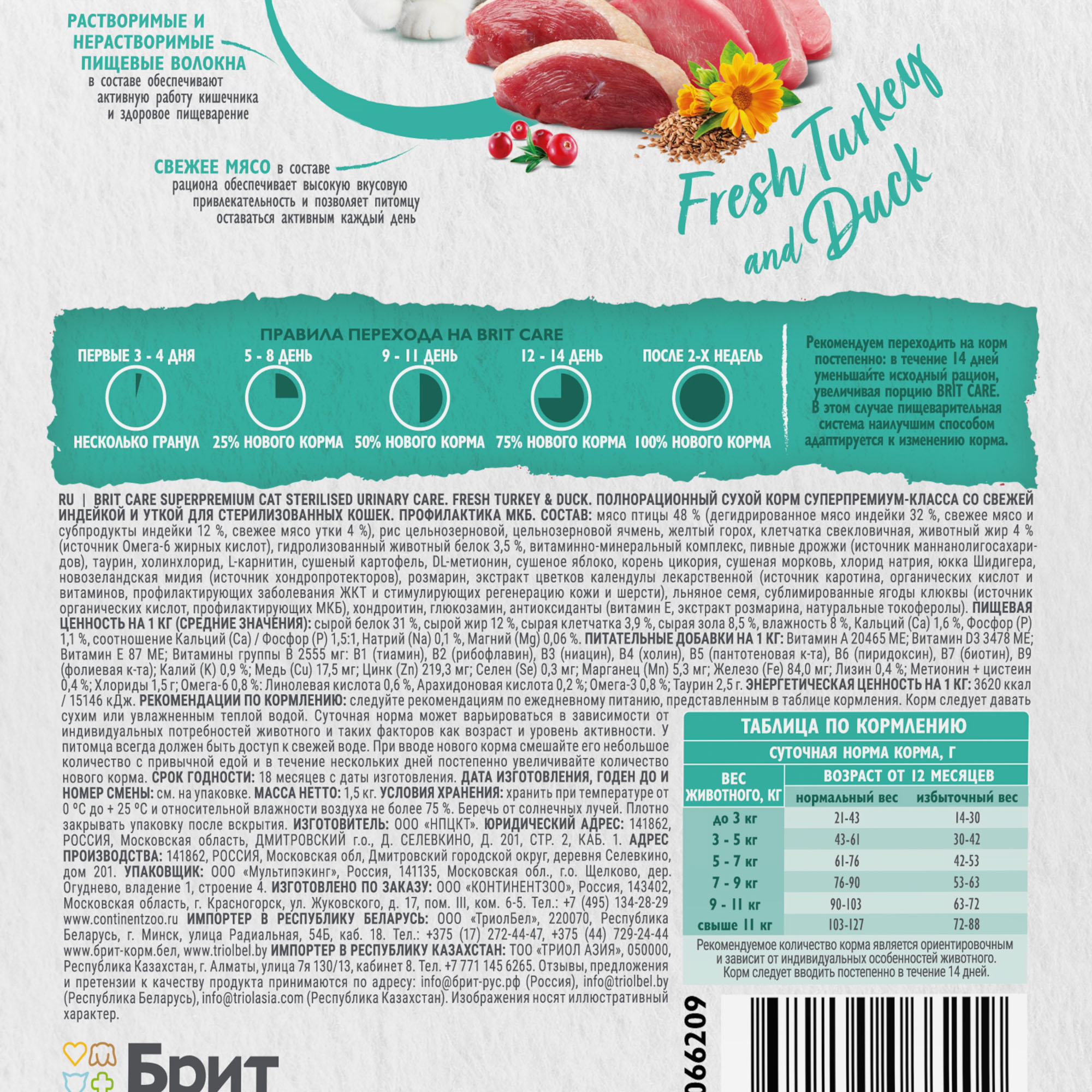 BRIT CARE, Сухой корм с индейкой и уткой д/стер.кошек "Cat Sterilised Urinary Care", 1.5 кг, 5066209