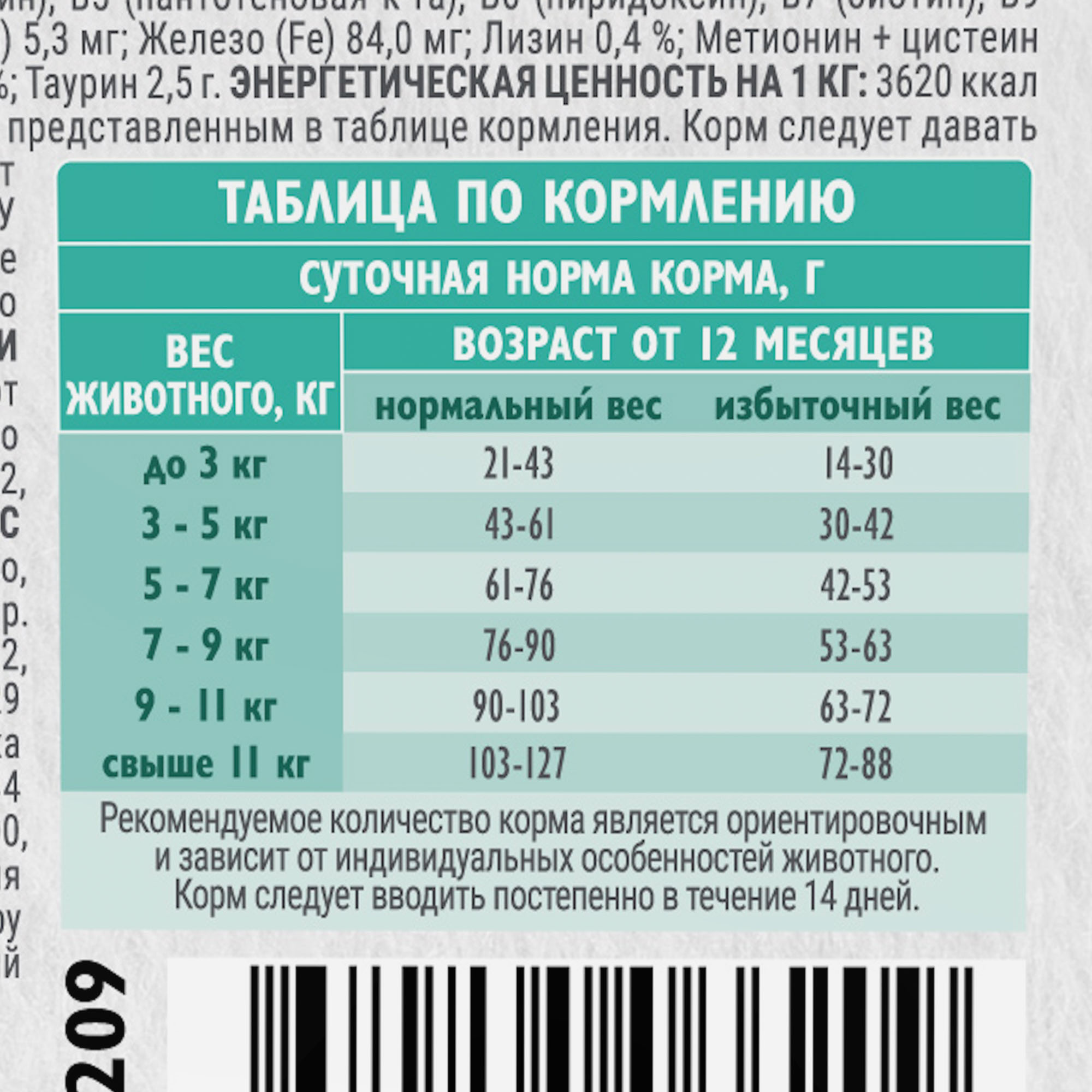 Питательные добавки на 1 кг: Витамин A 20465 МЕ; Витамин D3 3478 МЕ; Витамин E 87 МЕ; Витамины группы В 2555 мг: В1 (тиамин), В2 (рибофлавин), В3 (ниацин), В4 (холин), В5 (пантотеновая к-та), В6 (пиридоксин), В7 (биотин), В9 (фолиевая к-та); Калий (K) 0,9 %; Медь (Cu) 17,5 мг; Цинк (Zn) 219,3 мг; Селен (Se) 0,3 мг; Марганец (Mn) 5,3 мг; Железо (Fe) 84,0 мг; Лизин 0,4 %; Метионин + цистеин 0,4 %; Хлориды 1,5 г; Омега-6 0,8 %: Линолевая кислота 0,6 %, Арахидоновая кислота 0,2 %; Омега-3 0,8 %; Таурин 2,5 г.