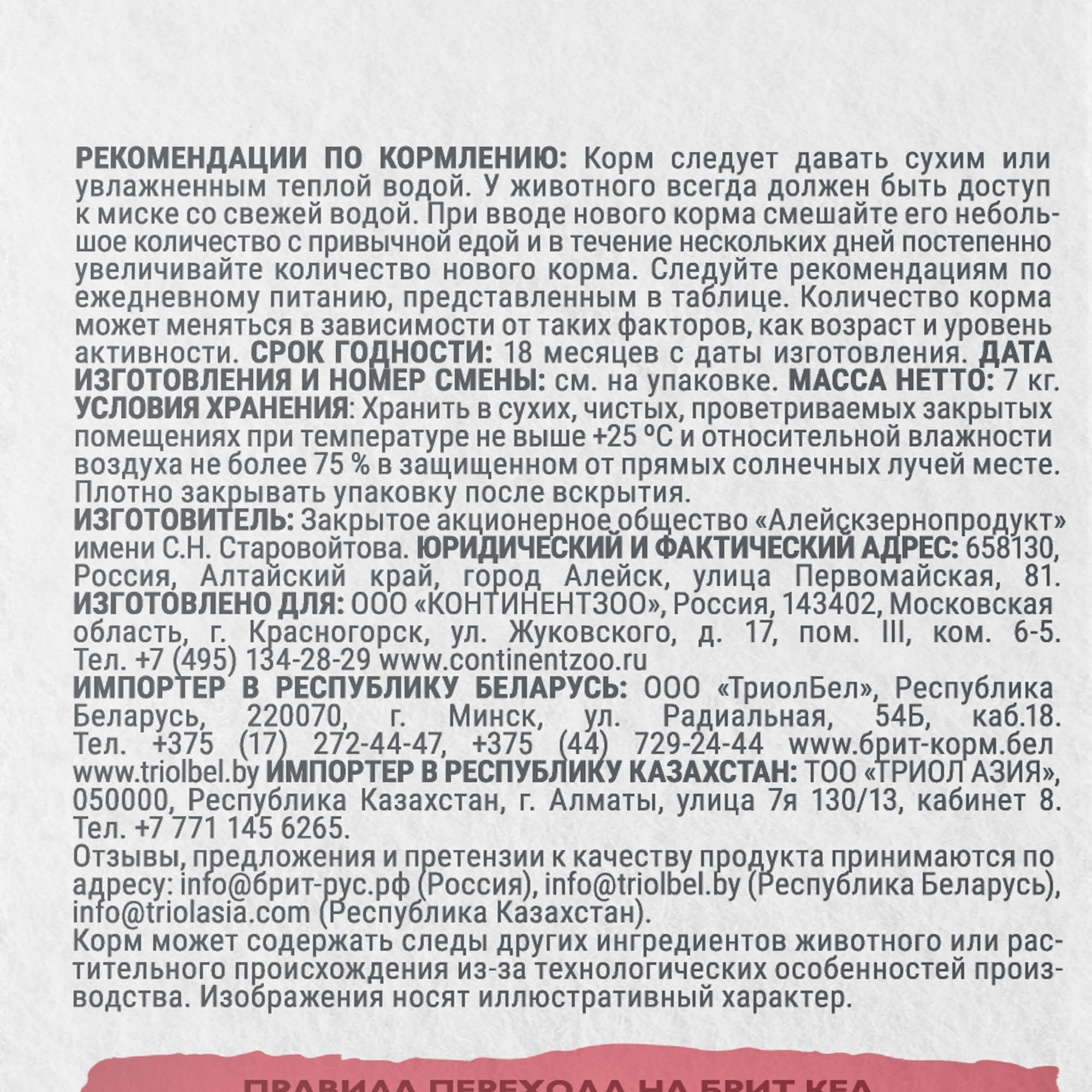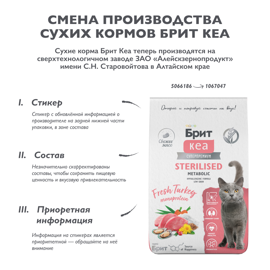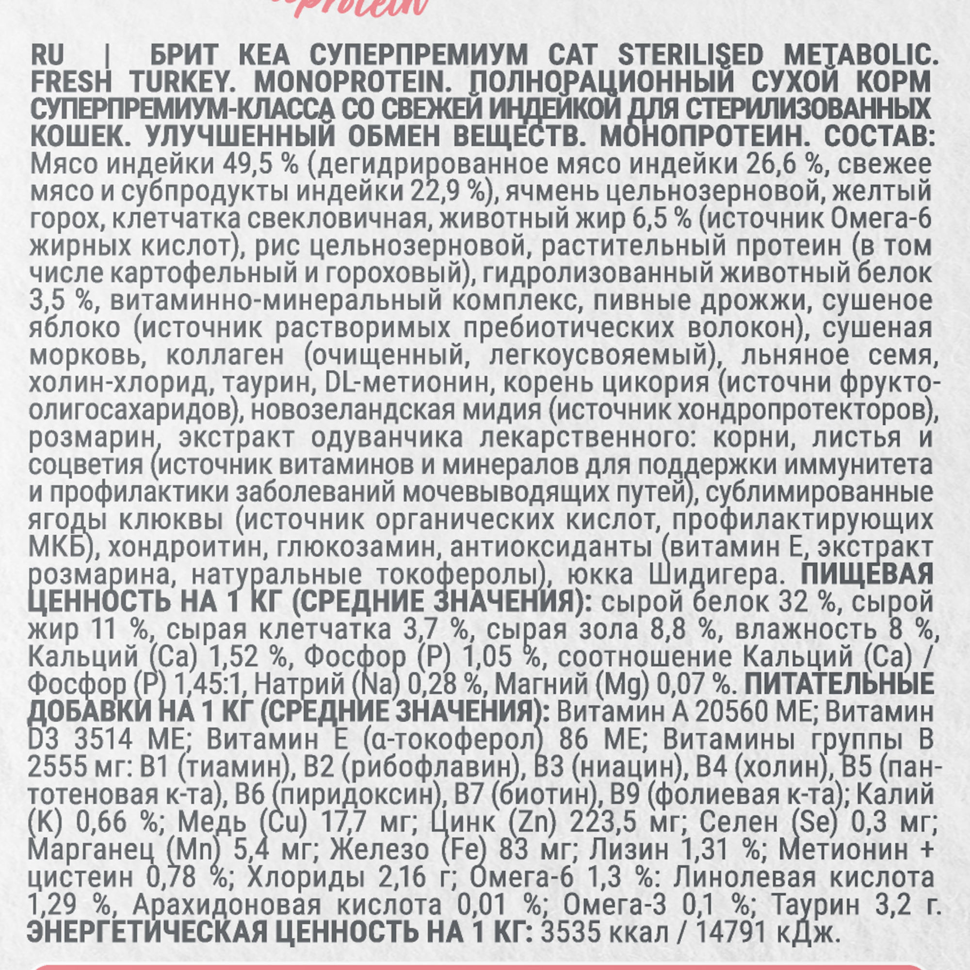 БРИТ КЕА, Сух. корм с индейкой для стерил. кошек. STERILISED METABOLIC. MONOPROTEIN, 7 кг, 1067047