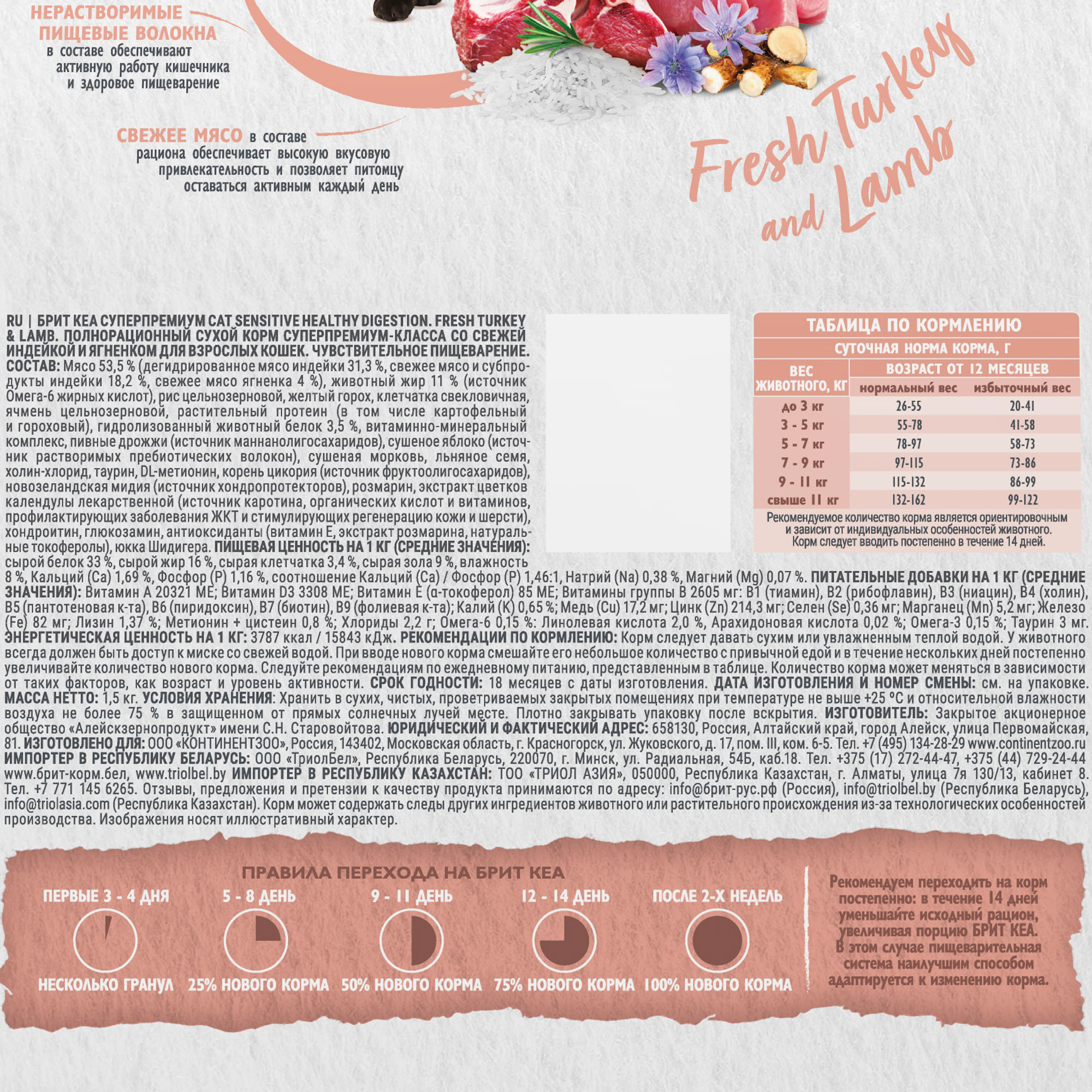 БРИТ КЕА, Сухой корм с индейкой и ягненком для взр. кошек.SENSITIVE HEALTHY DIGESTION,1.5кг, 1067009