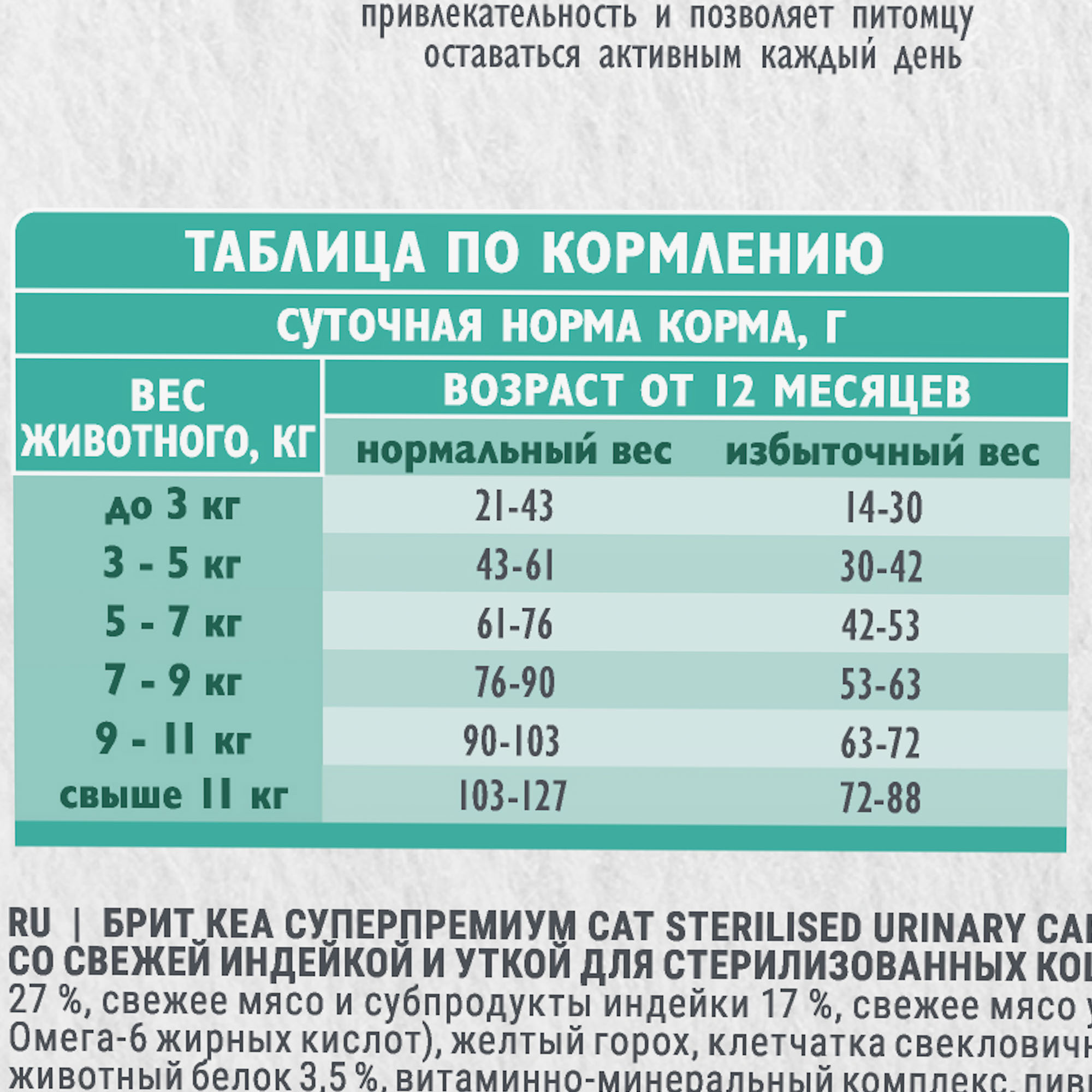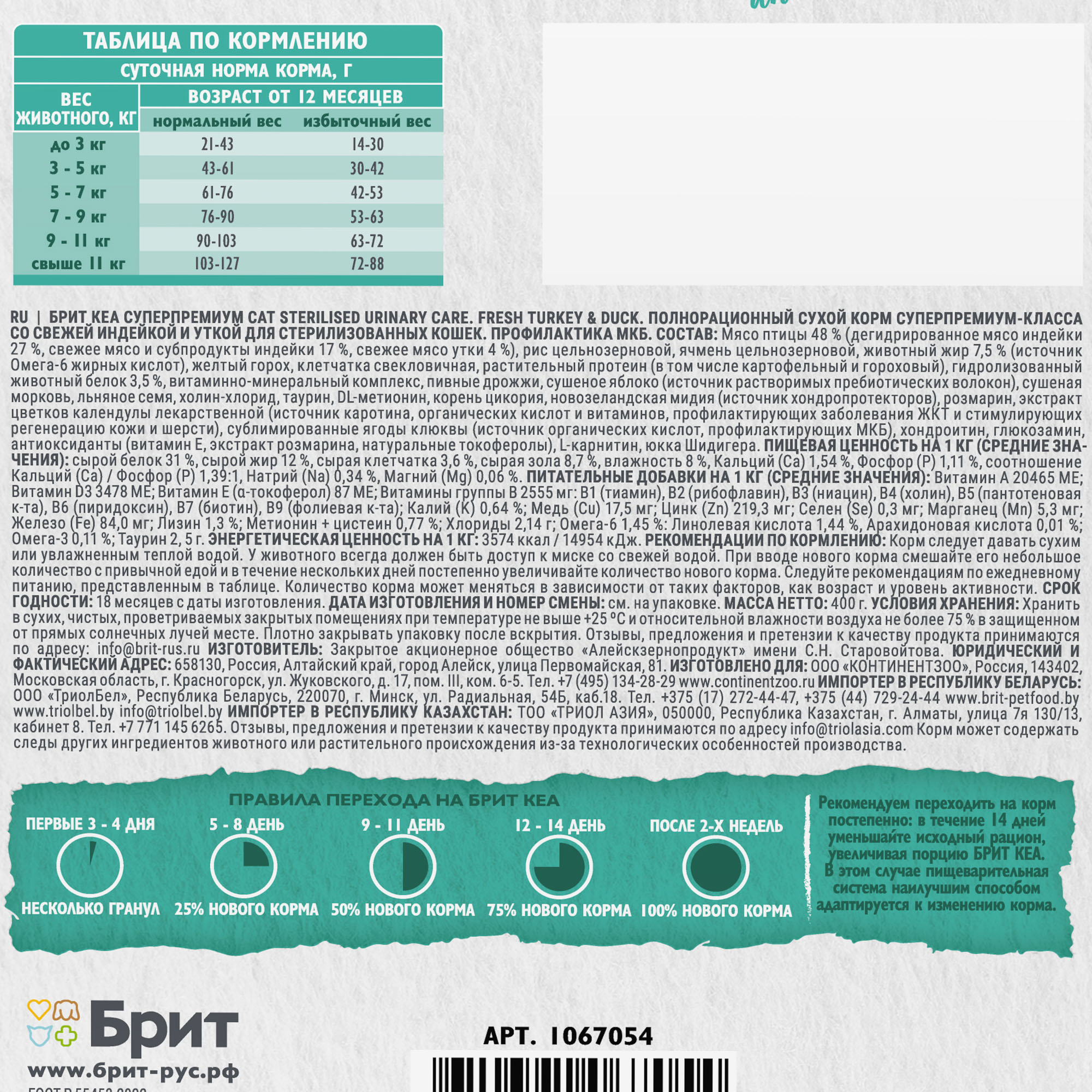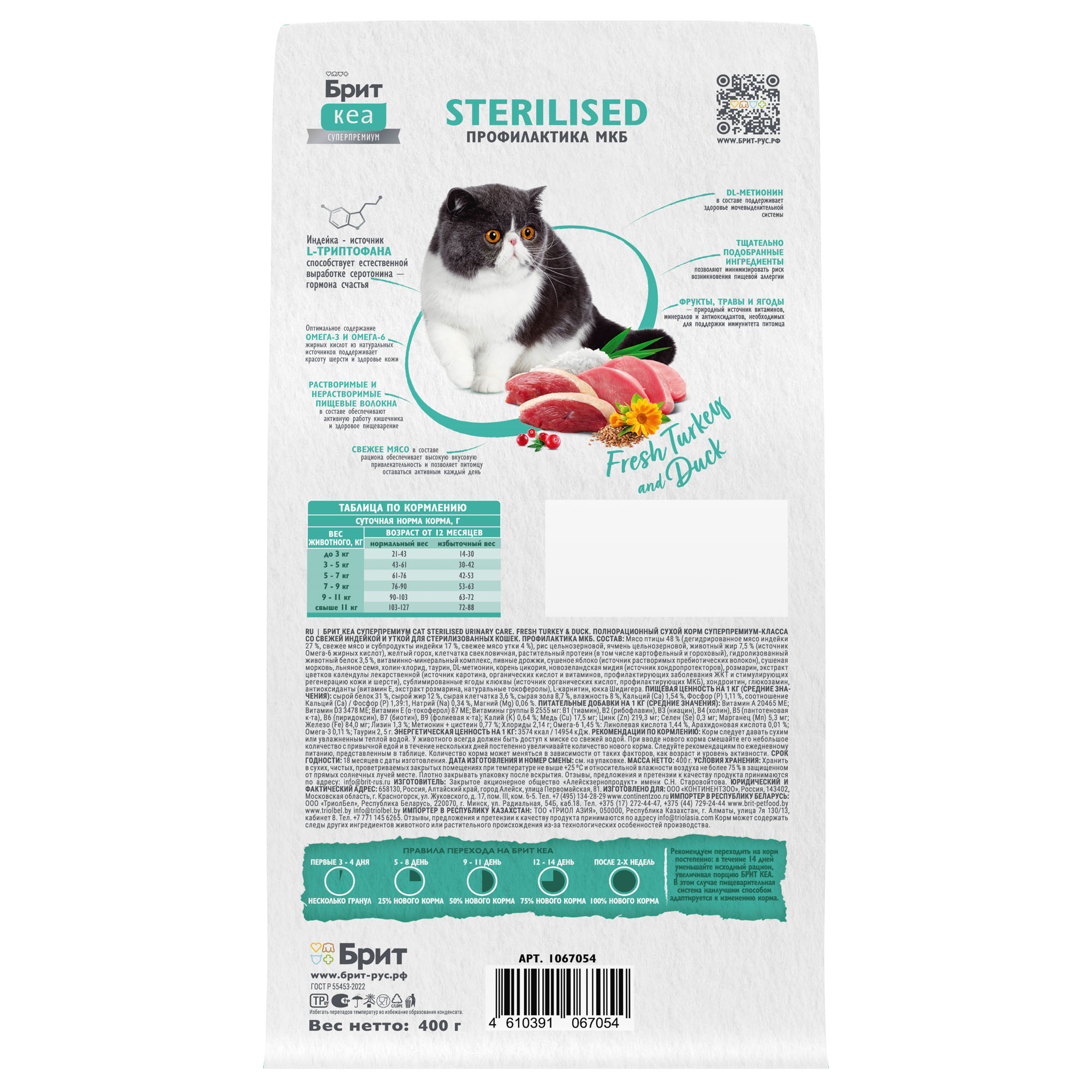 БРИТ КЕА, Сухой корм с индейкой и уткой для стерил. кошек. STERILISED URINARY CARE, 0.4 кг, 1067054
