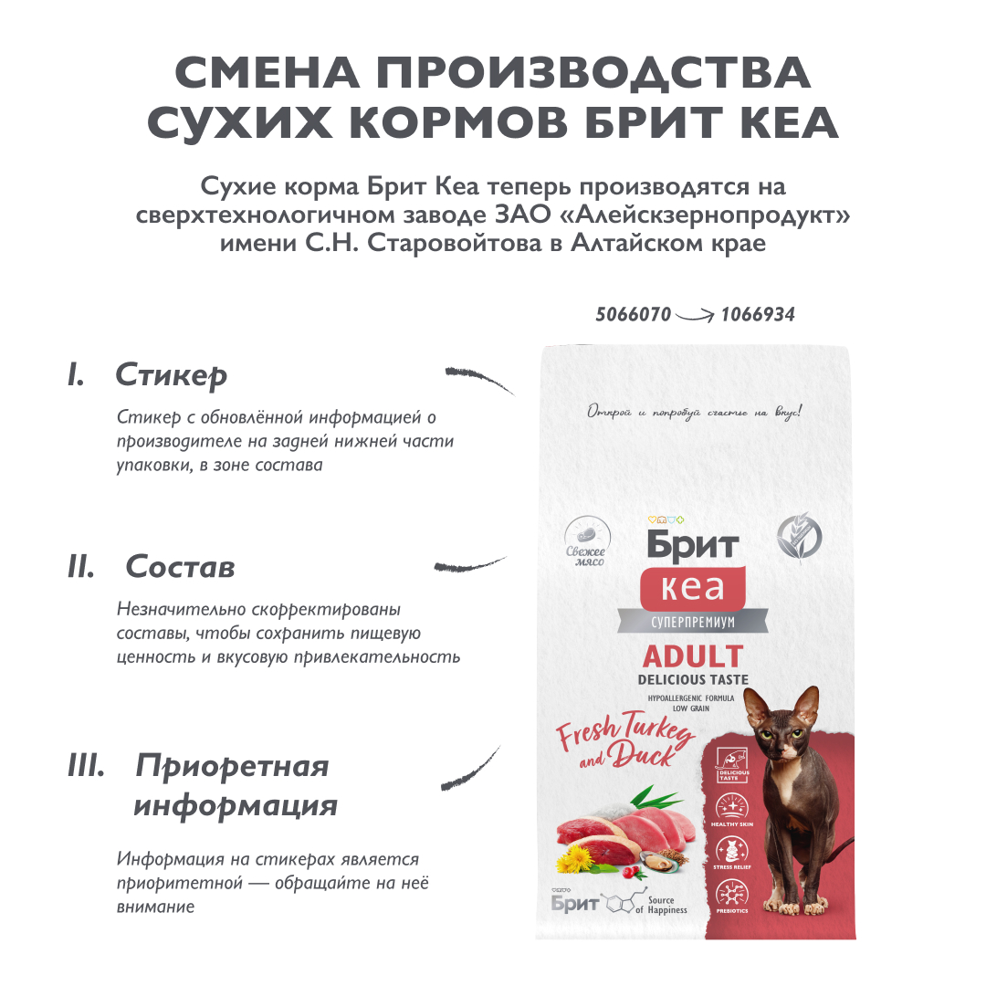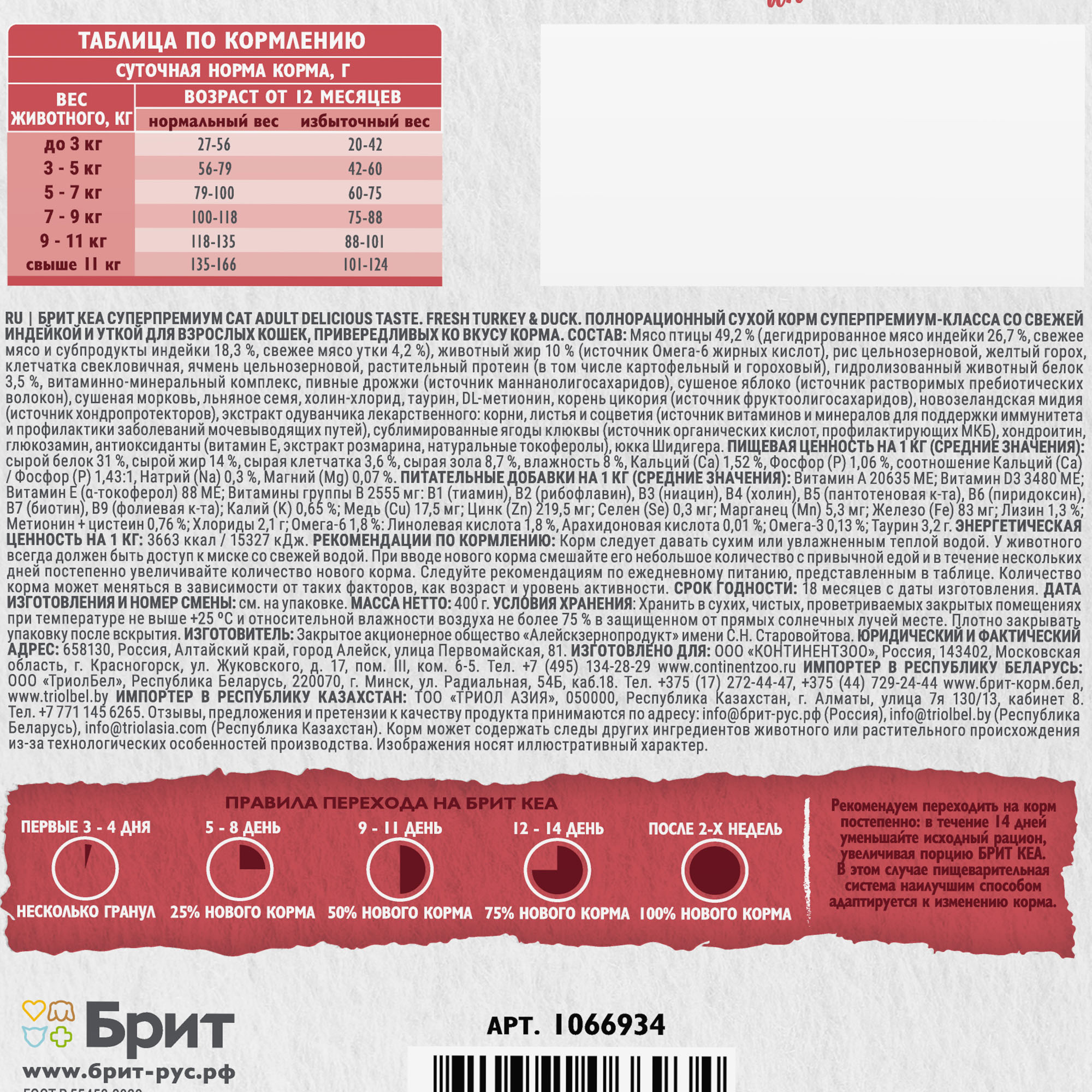 БРИТ КЕА, Сухой корм с индейкой и уткой для взрослых кошек. ADULT DELICIOUS TASTE, 0.4 кг, 1066934