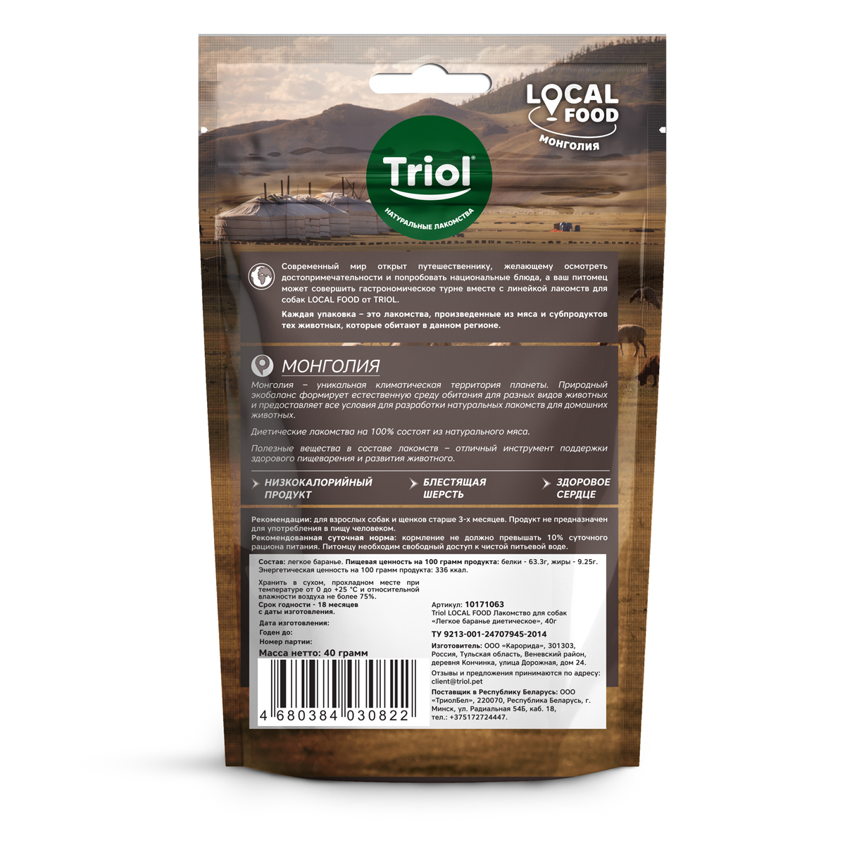 Монголия – уникальная климатическая территория планеты. Природный экобаланс формирует естественную среду обитания для разных видов животных и предоставляет все условия для разработки натуральных лакомств для домашних животных. Легкое баранье диетическое - это на 100% натуральное гипоаллергенное лакомство для собак, приготовленное с сохранением всех полезных свойств, витаминов и микроэлементов. В нем содержится большое количество коллагена, фосфора и железа, положительно влияющих на здоровье суставов, костей и зубов. Это вкусное и полезное угощение подойдет для собак всех пород и возрастов. Вес нетто - 40г.