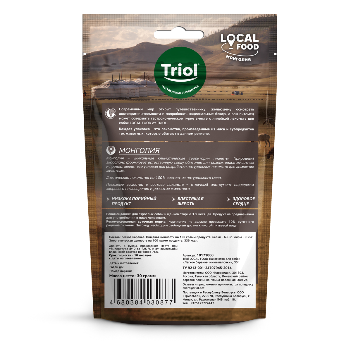 Triol LOCAL FOOD Лакомство для собак "Легкое баранье, мини-палочки", 30г