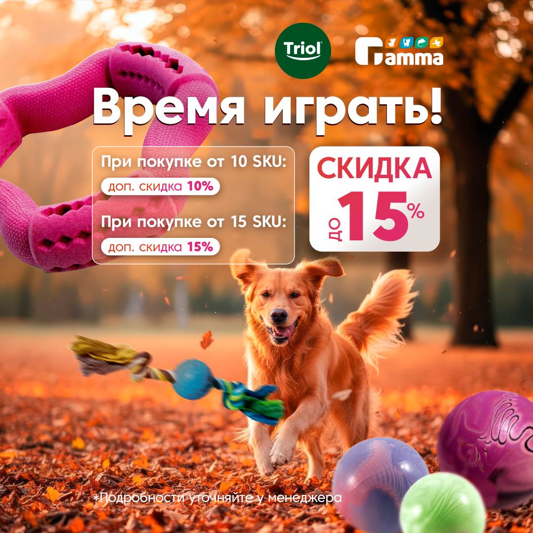 С 1 по 30 ноября при покупке акционного ассортимента игрушек для кошек и собак Triol и Gamma получите дополнительную скидку к скидке партнера: